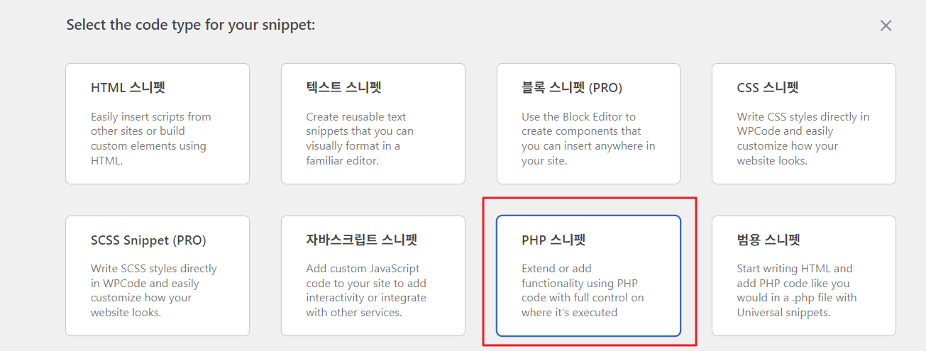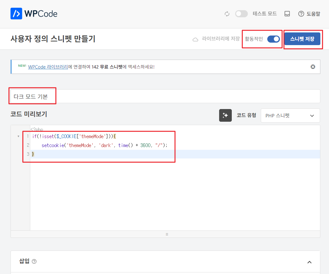 B. 코드 스니펫 메뉴에 접속하셔서 아래와 같이 PHP 스니펫을 추가해주세요.